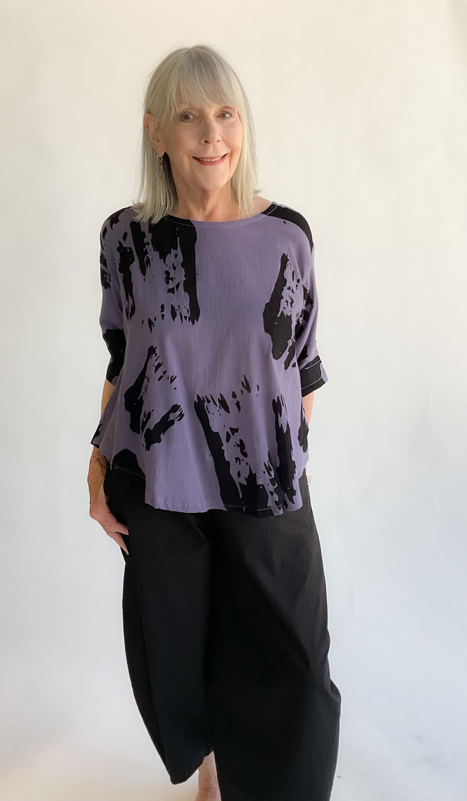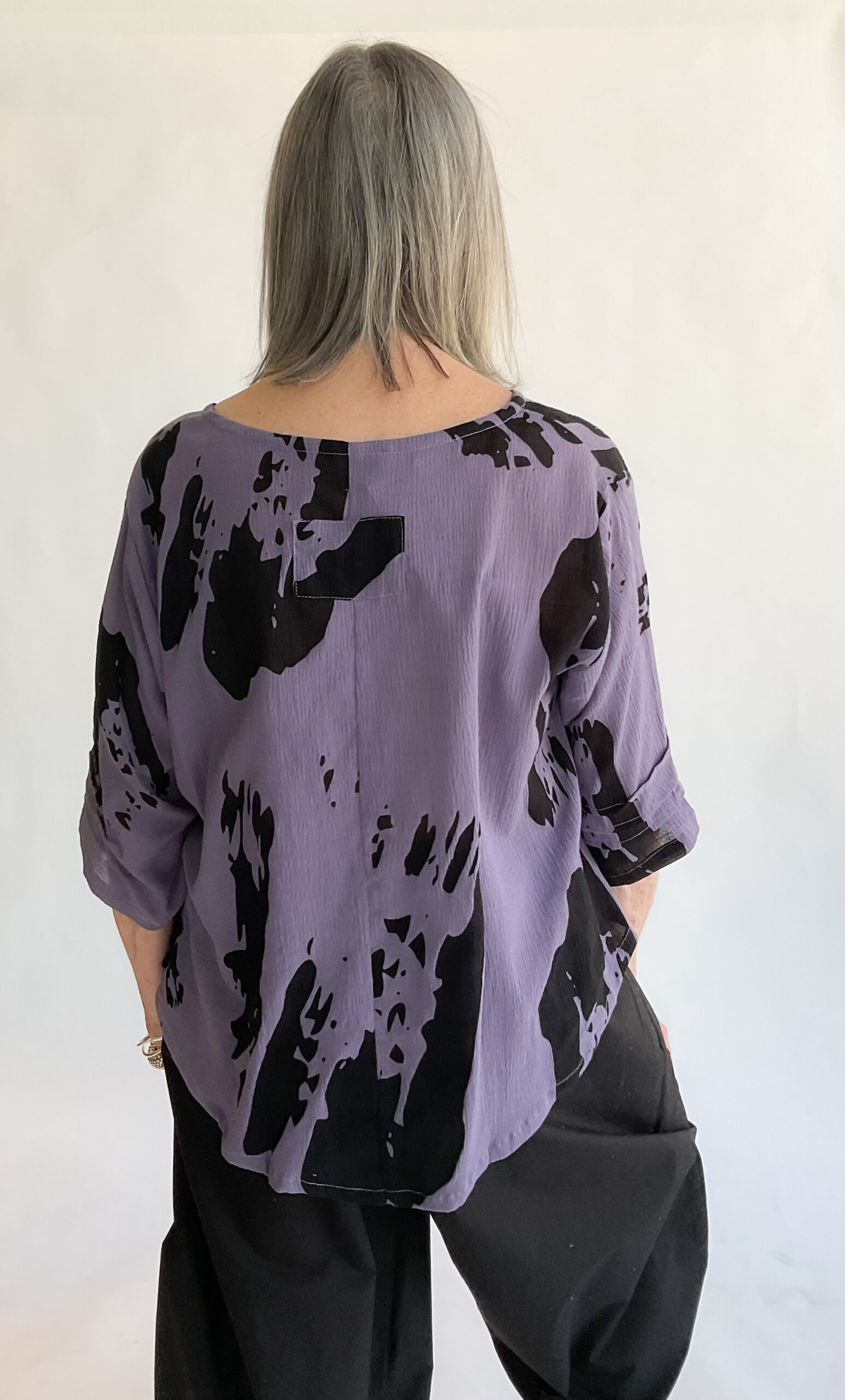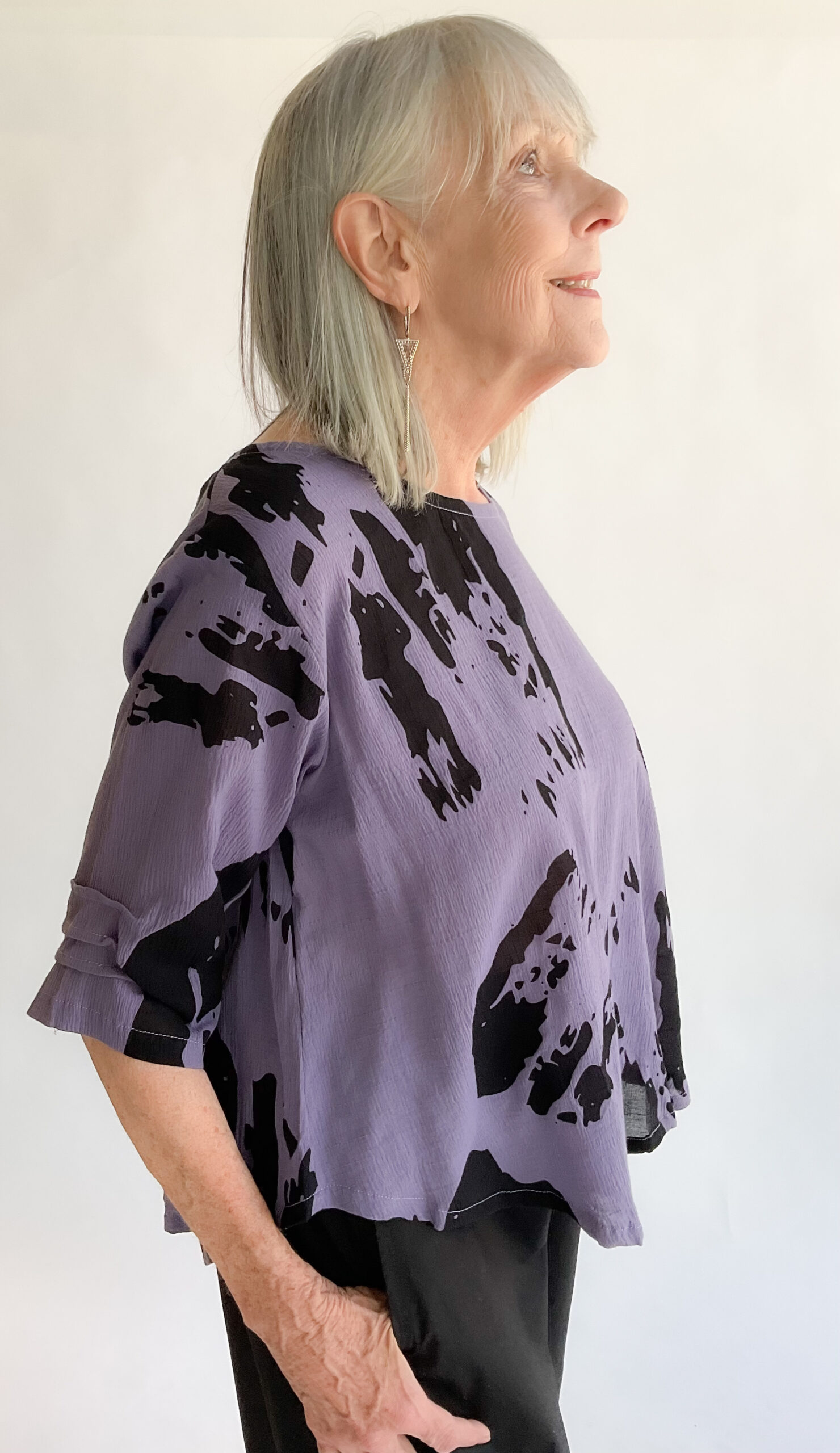 Perfect for warmer weather, the Essential Blouse is made in a lightweight breathable cotton with a crinkled gauze-like texture. It features a high rounded neckline, flattering A-line shape and a trio of pleats on the elbow length sleeves. The curved shirttail hemline is a tad longer in back and features an upper back patch detail. The lovely hand painted Kimono print lends artistic panache to this refined top. 100% cotton. Machine wash gentle, line dry.