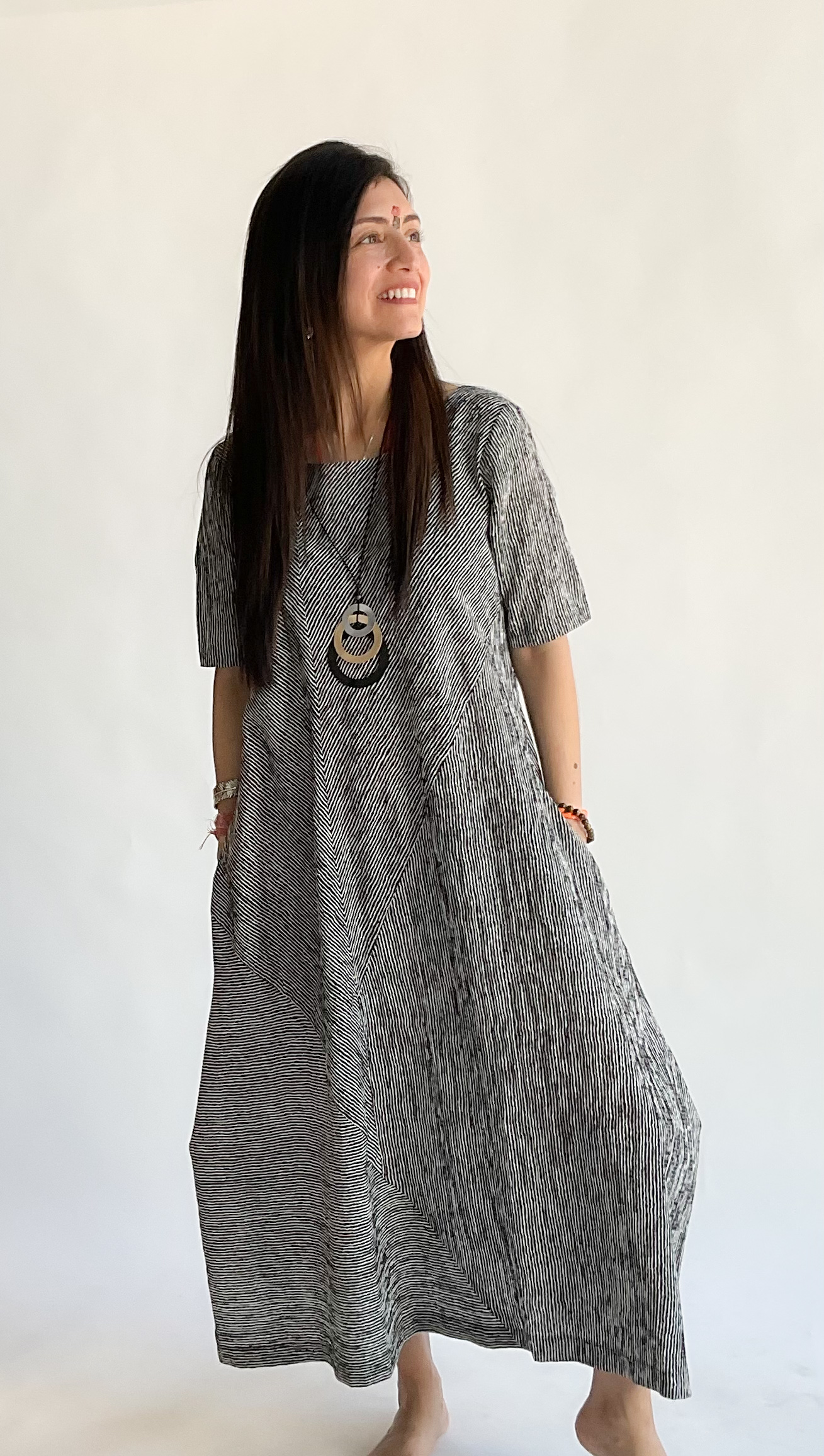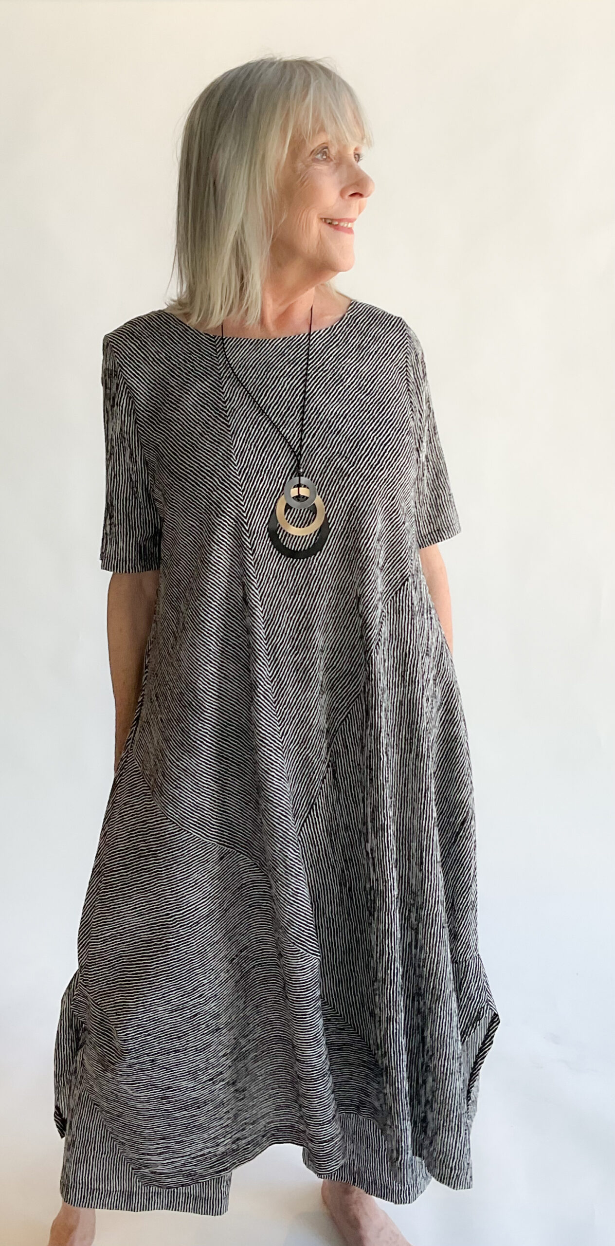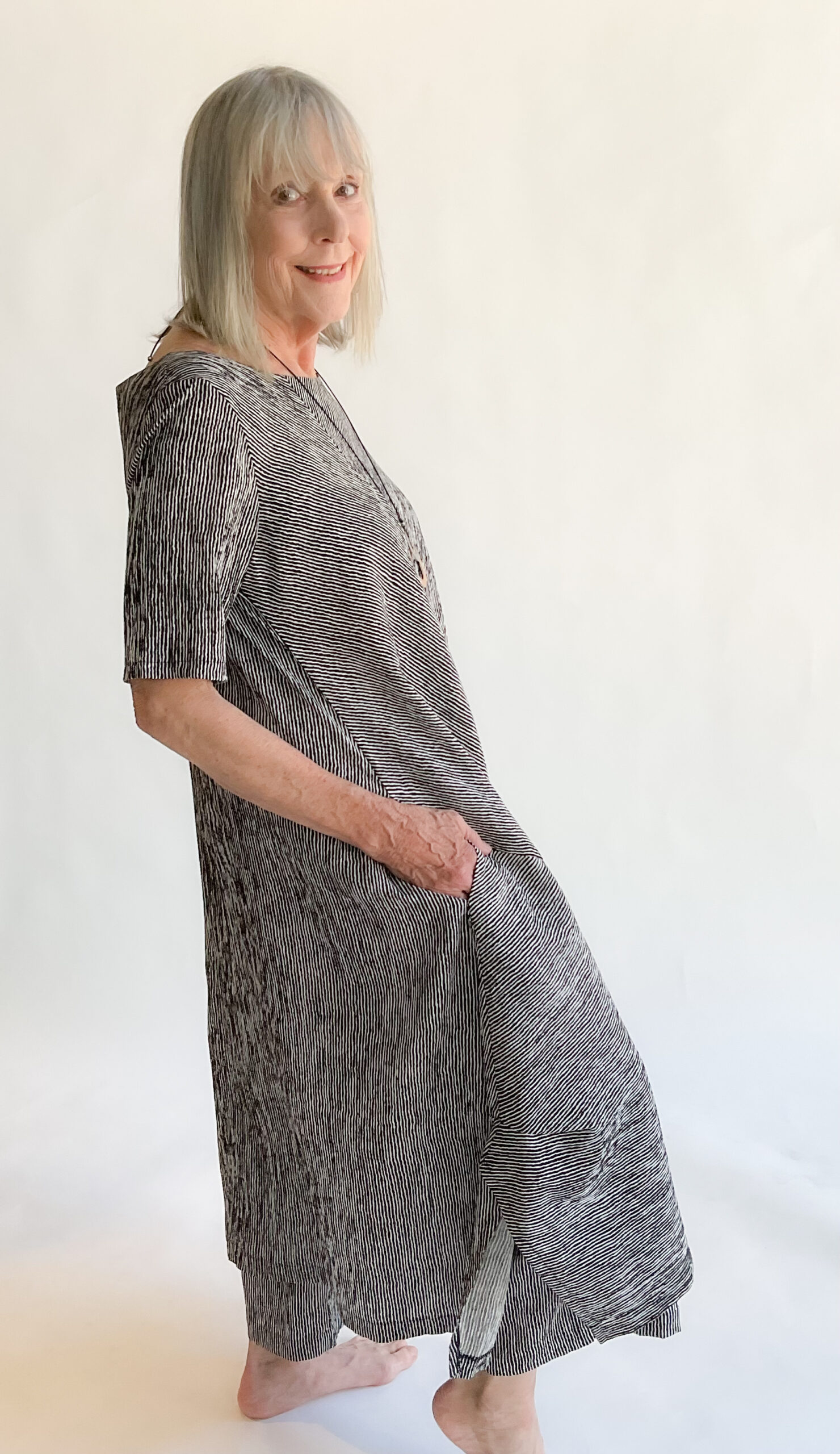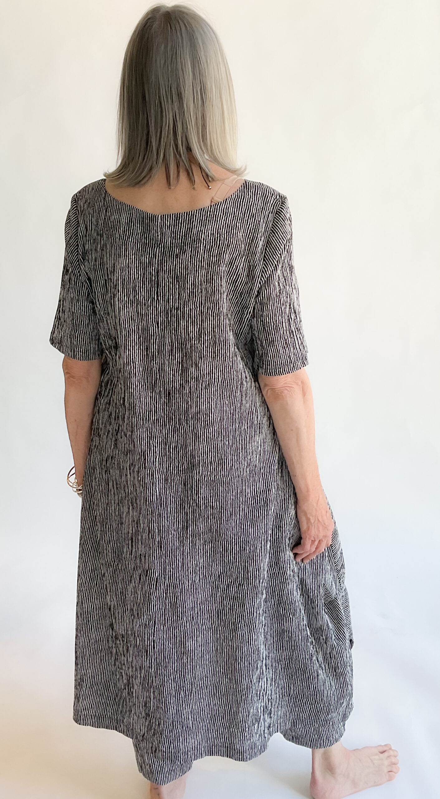 This Florence Dress has a round neckline, short sleeves, and a voluminous skirt enhanced by side tucks. The side pockets are a practical plus. Designed for modern comfort and graceful movement, it’s a refined choice for any occasion. Machine wash cold, gentle. Line dry. 56% Viscose, 43% Polyester, 1% Elastic. Made in USA.