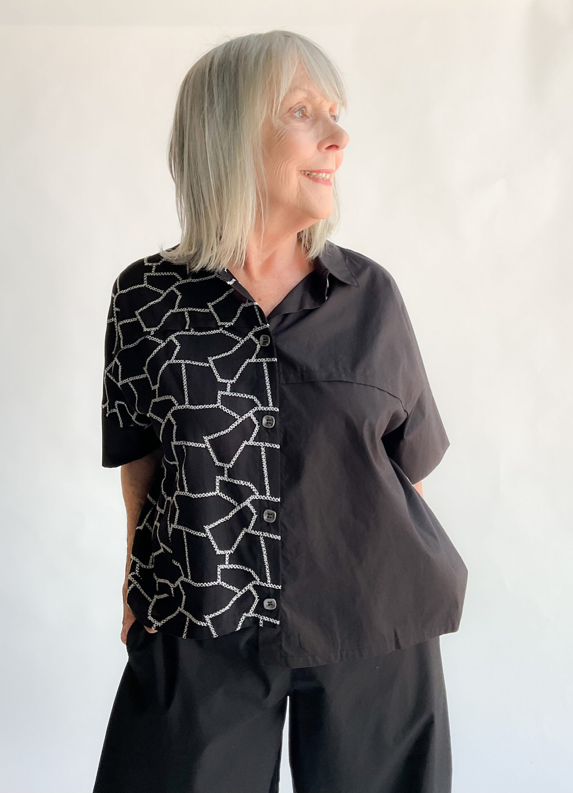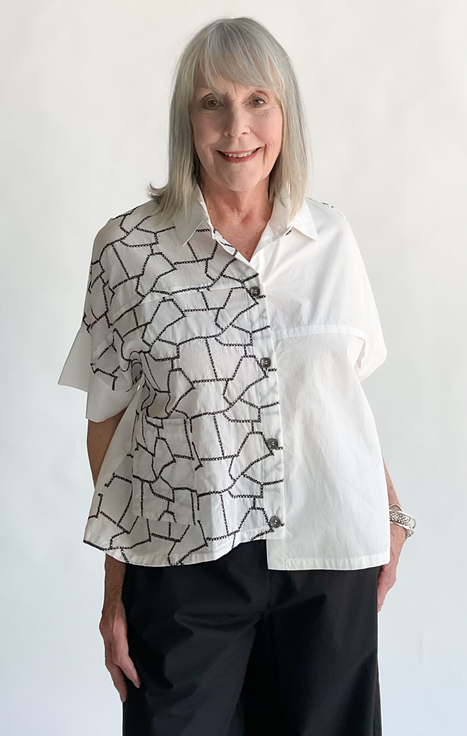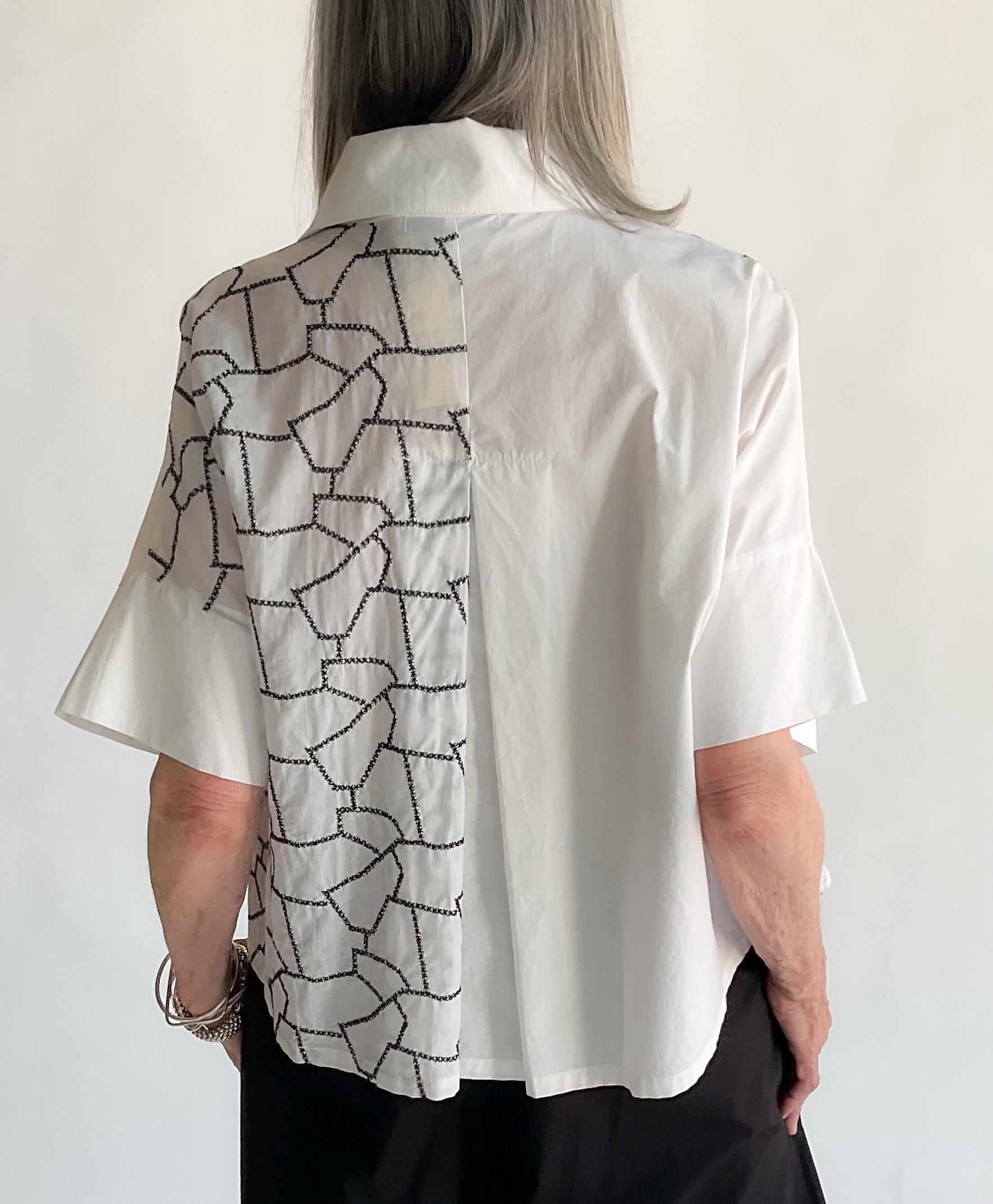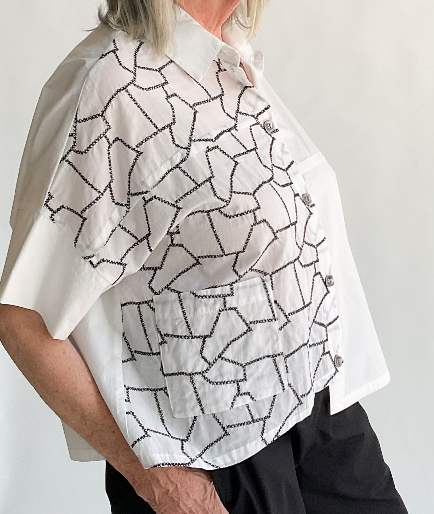 The Kaleen Shirt is an audacious blend of structure with playful details. With a button up collar, drop shoulder sleeves, and an asymmetrical hem, this garment gorgeously flows with any pair of bottoms. Artfully constructed with solid cotton woven fabric and embroidered contrast, it’s a statement piece explored with rich details and texture. 100% Cotton. Machine wash cold. MADE IN USA.