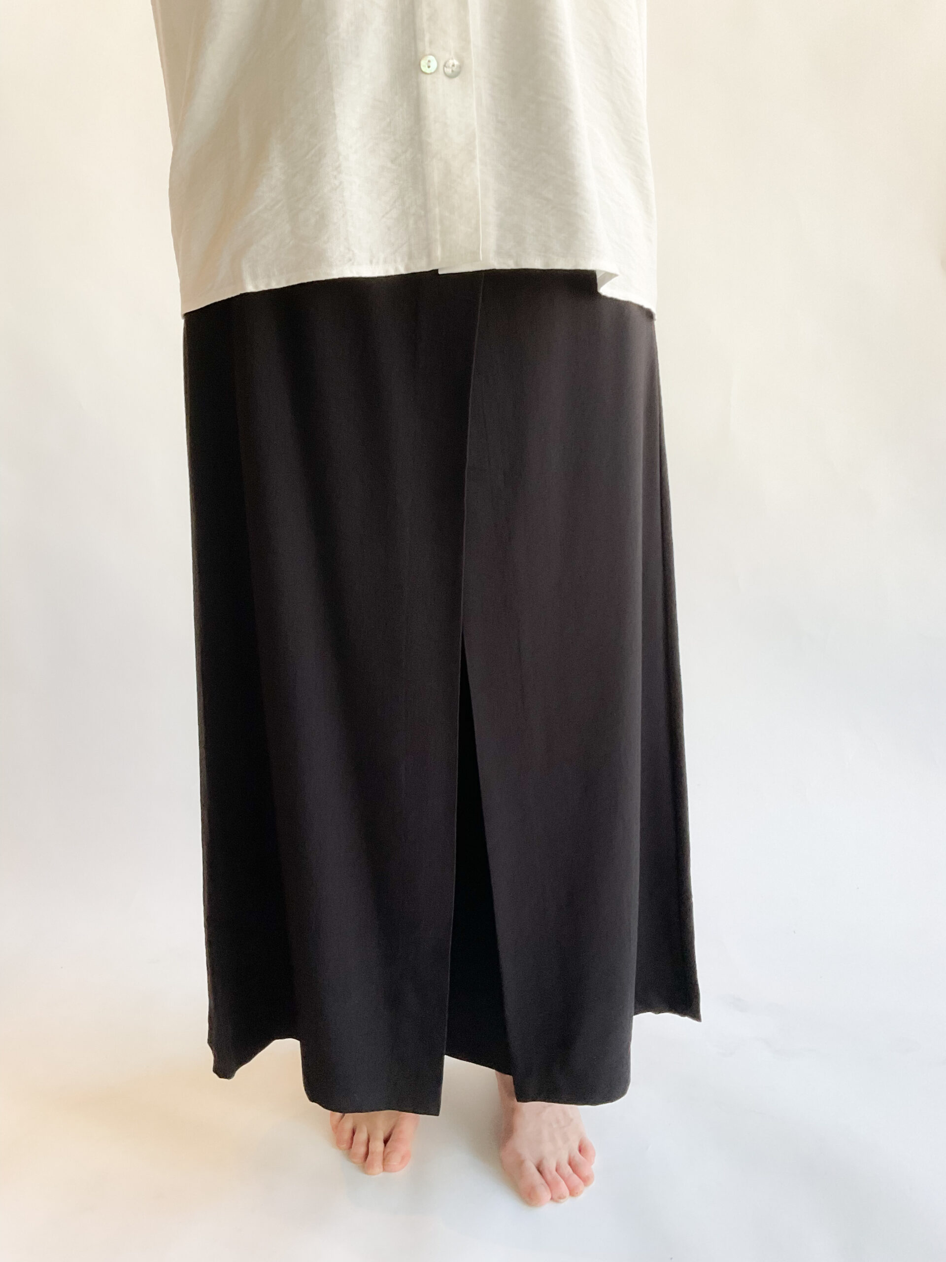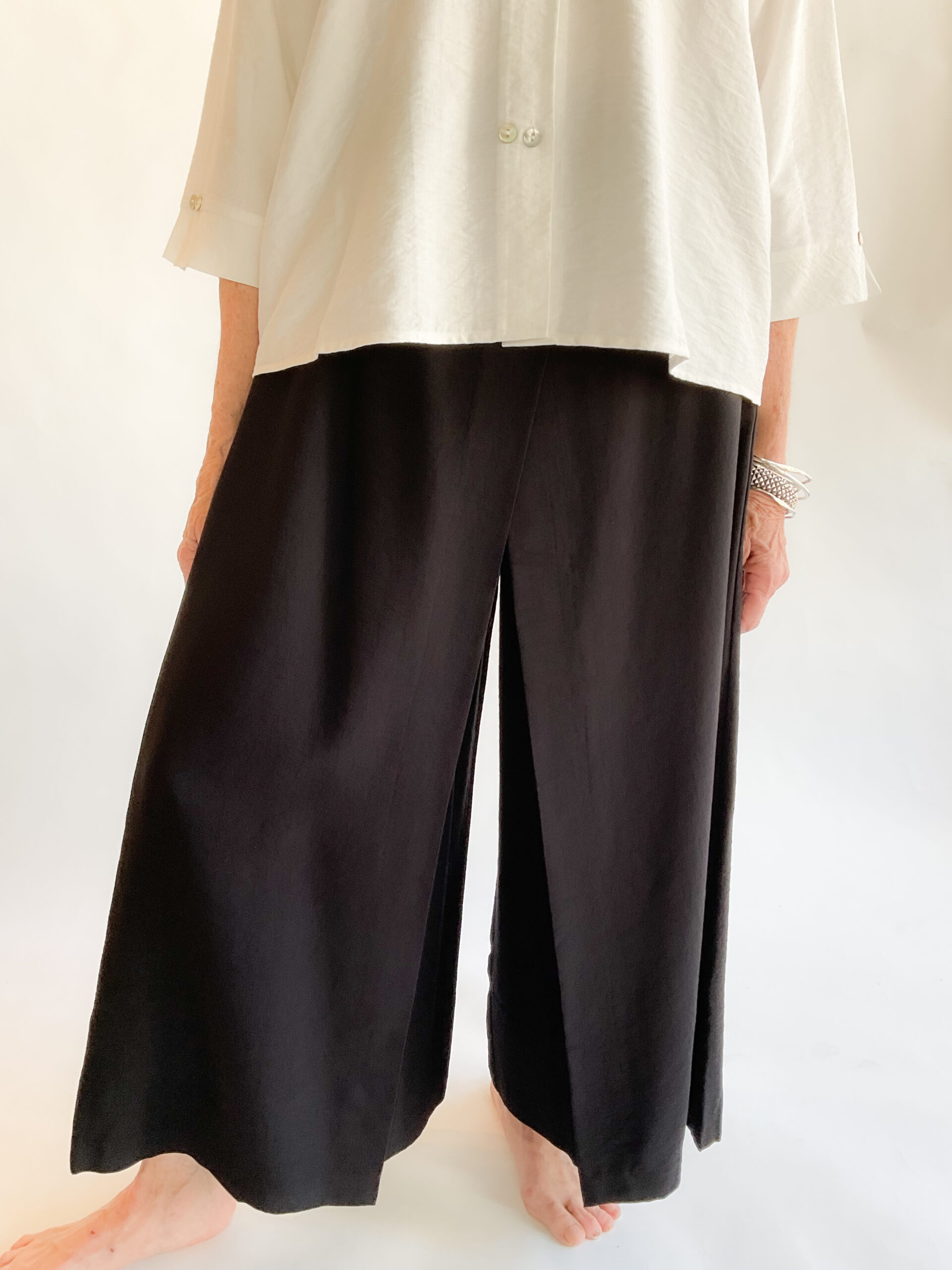 The Meadow Pant redefines versatility by blending the elegance of a skirt with the practicality of pants. Featuring a sleek flat front paired, these pants have a tailored fit and wide leg. Crafted with a double front layer of fabric, they drape gracefully to mimic the fluid movement of a skirt, offering both sophistication and ease. Ideal for those who seek refined style without compromising comfort, these customer favorites elevate any wardrobe with their unique design and effortless charm. The classic black color make it a wardrobe essential. This is the best-selling pant for this line. 87% Rayon, 13% Nylon. Machine wash cold, gentle. Line dry.