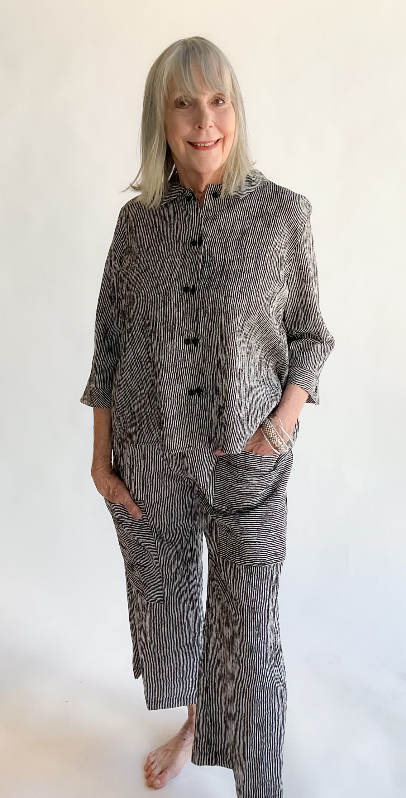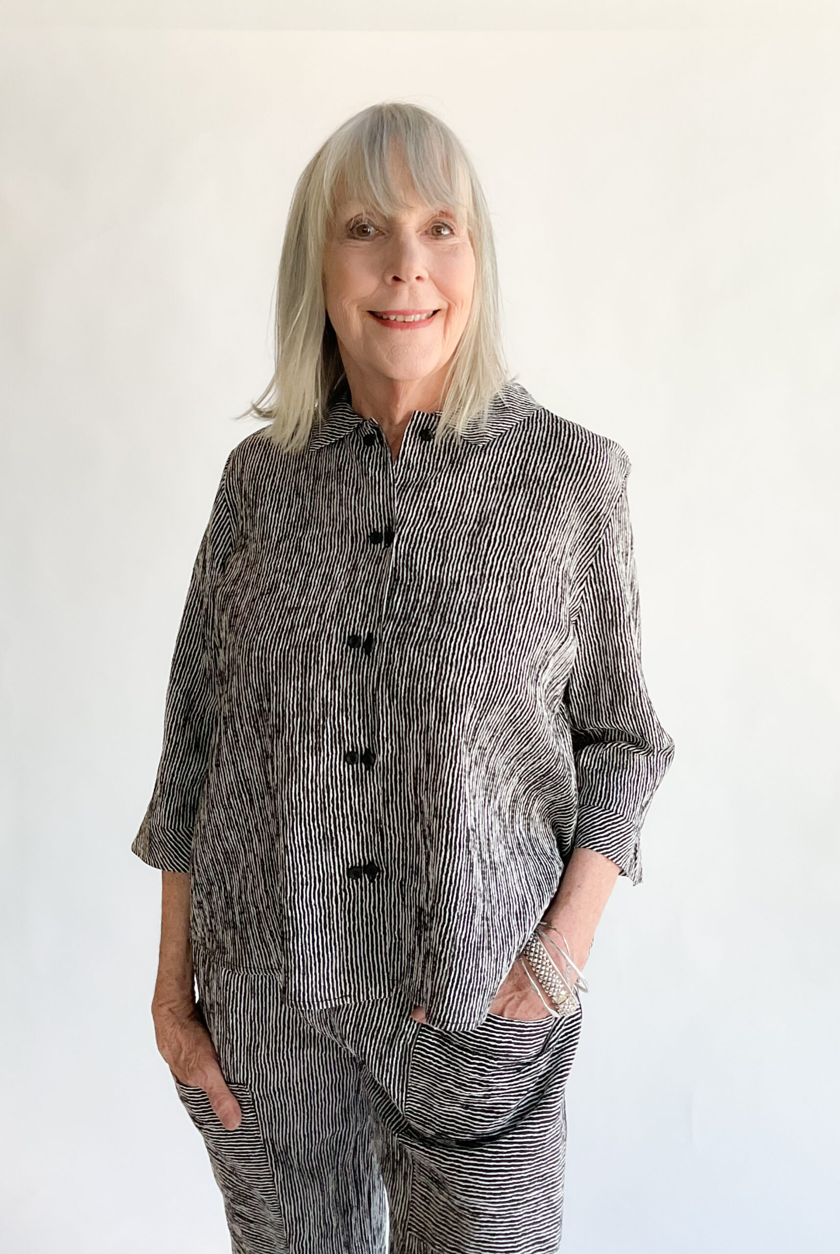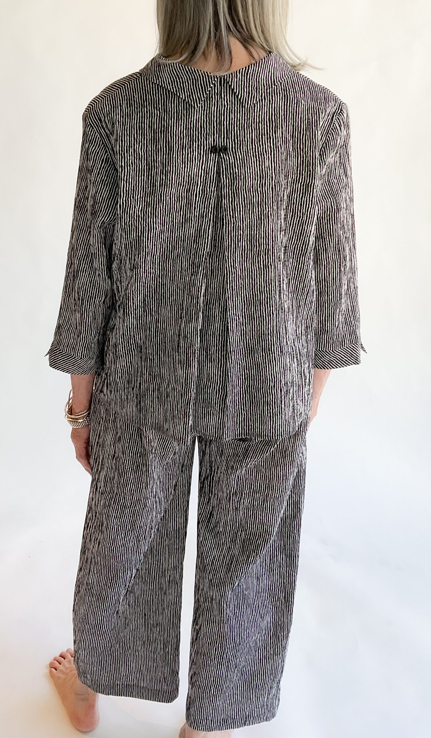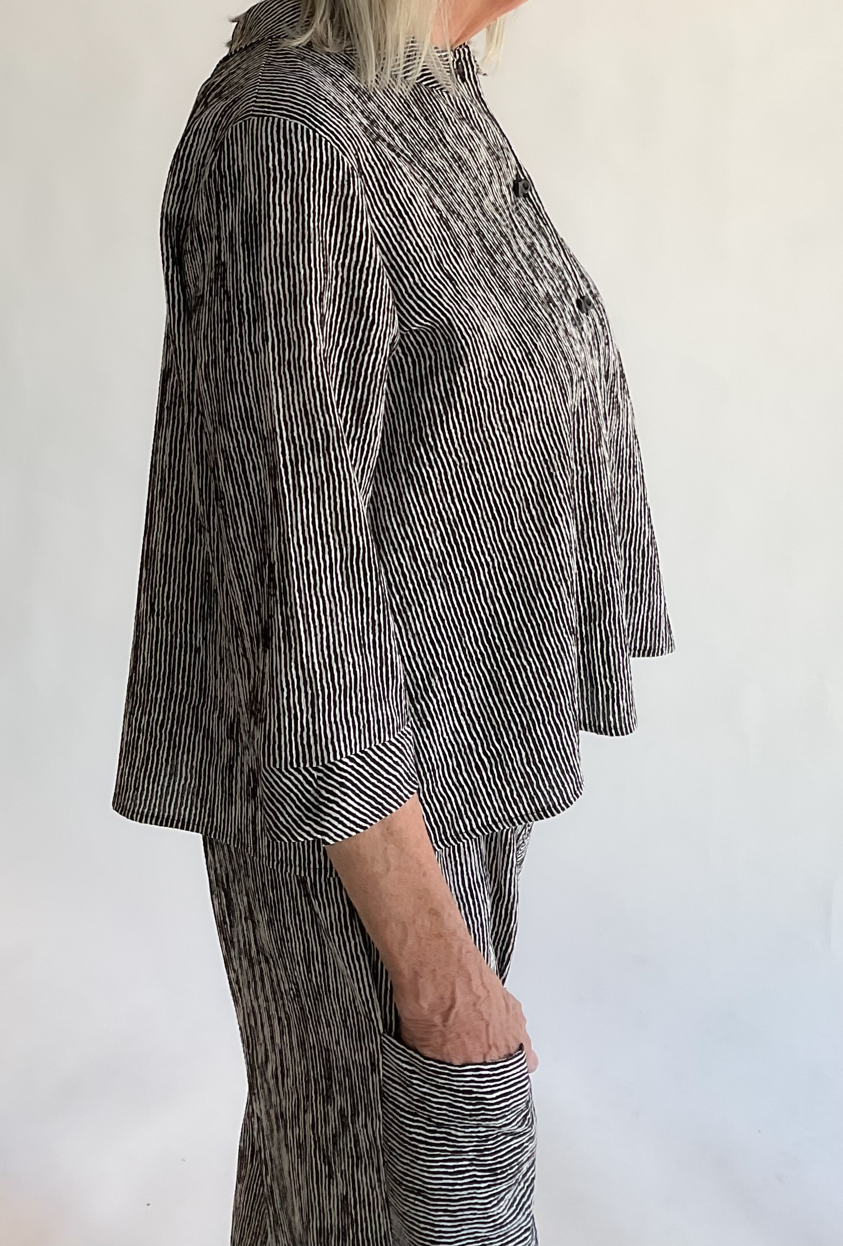 Enjoy timeless style with the Niche Ridge Stripe Twinbutton Top. This is the best seller for this designer. This refined piece features double sets of buttons that cascade down the front, enhancing its sophisticated appeal. The easy A-line silhouette and straight hem create a graceful, flattering fit, while the inverted pleat and open notched collar at the back add subtle interest. Crafted from lightweight, breathable fabric in a subtle black and white stripe, this blouse offers exceptional comfort and versatility, making it a great choice for travel or polished everyday wear. Made in the USA. 56% Viscose, 43% Polyester, 1% Elastic. Machine wash cold, gentle. Line dry.